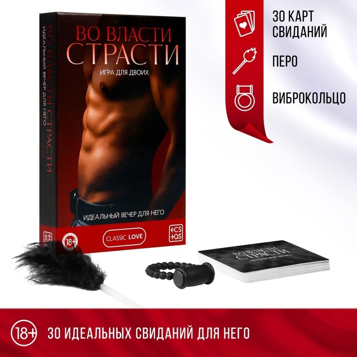 Игра для пар «Во власти страсти. Идеальный вечер для него», 3 в 1 (30 карт, перо, виброкольцо), 18+ 7453544