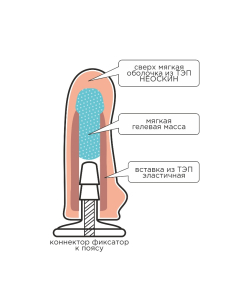 Пояс изготовлен из эластичного полимера. Изготовленный из полимера страпон с двумя коннекторами обладает возможностью плотного охвата тела, легкой регулировкой. Ремни из стропы средней жесткости тоже имеют умеренную эластичность, снабжены регуляторами и фастексами (фиксаторами – застежками). Замысел конструкции в создании аналога эластичного белья, удобстве, отсутствии острых краев. Верхний коннектор (бобышка) направлен наружу для соединения с внешней насадкой. Нижний - направлен внутрь и предназначен для внутренней насадки. Коннекторы состоят из двух частей, соединяемых между собой с помощью резьбы. Насадки можно приобретать отдельно. Коннекторы имеют стандартные размеры по толщине и длине. Внутренняя насадка входит в комплект. Сделана из материала неоскин с каркасом.