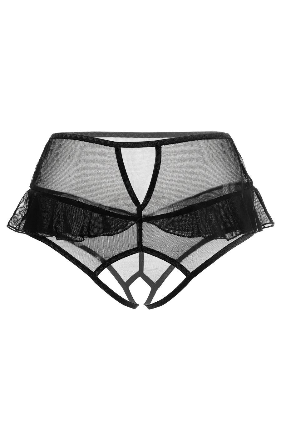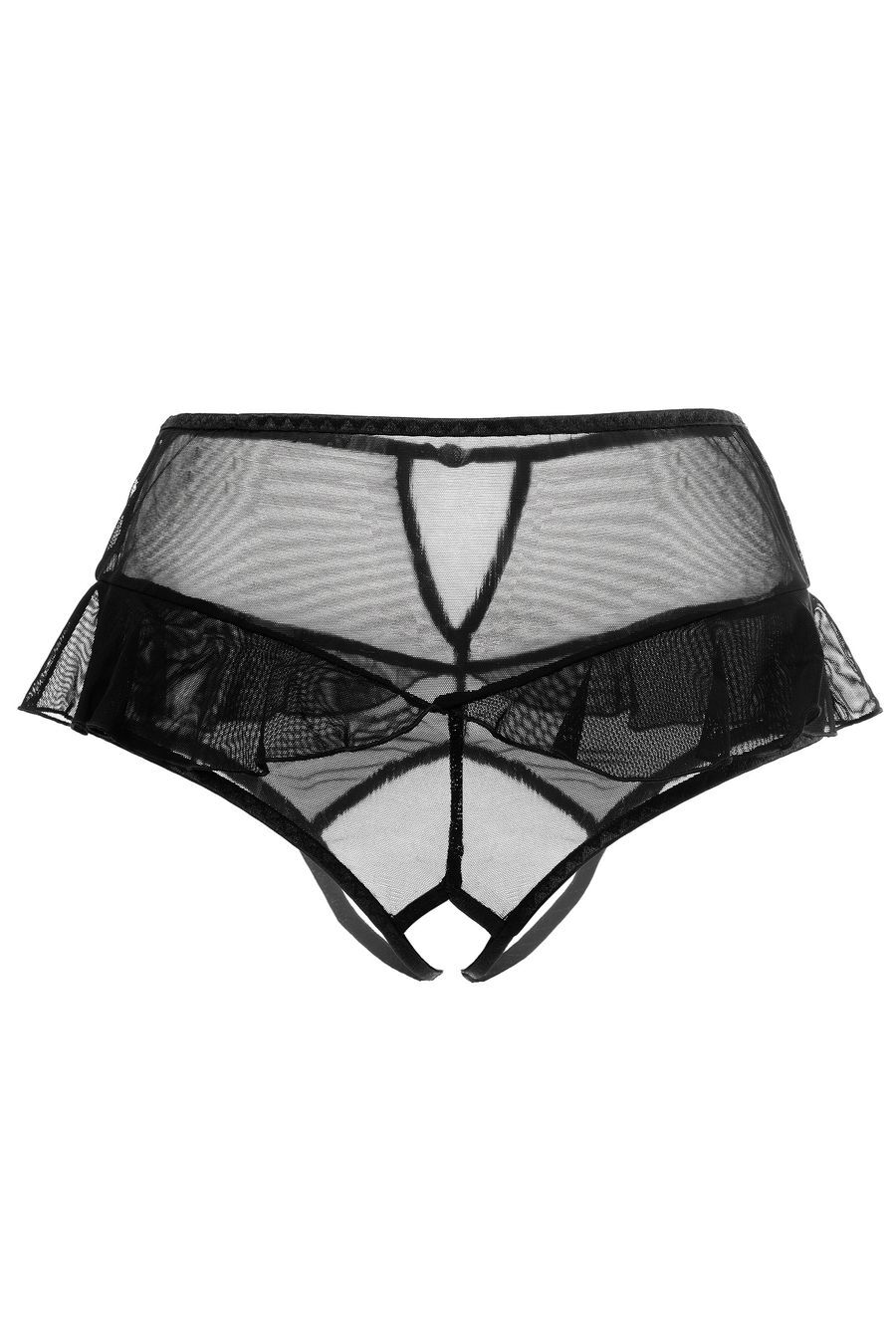 Эластичная сетка изящно подчеркивает линию бедер, а игривые воланы обезоруживают своей невинностью. Высокая посадка эффектно выделяет талию и деликатно скрывает мелкие недостатки фигуры. Пикантный вырез сзади подстегивает мужскую фантазию, а доступ к интимной зоне позволяет наслаждаться игрой, не снимая трусики.